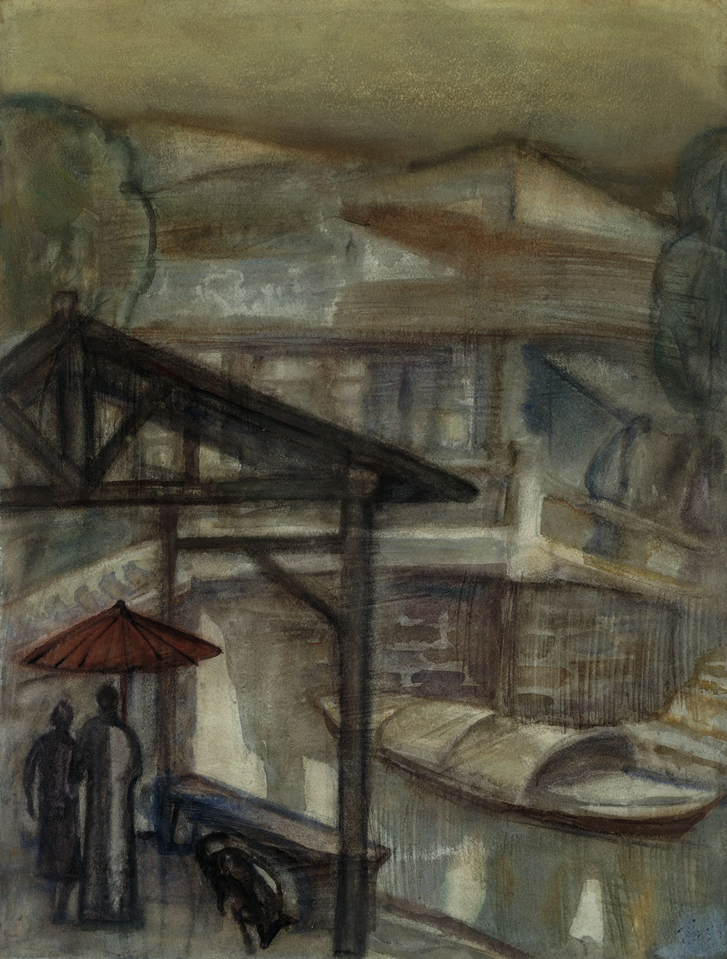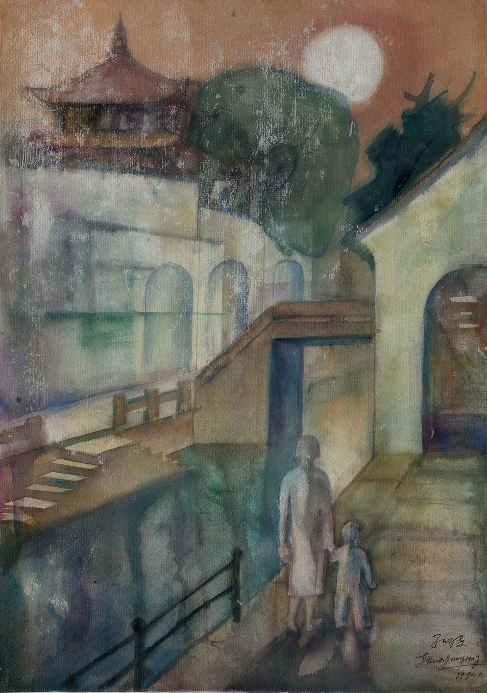 莊弘醒先生,童年生活在民國時代的南潯。這里,水光月色下的灰青瓦當、故園春色里的茶色欄柵、油紙傘下映輝著的夢里故人、斑駁粉墻上蕩漾出的虛空晃影,成為他不盡的鄉愁。這種故鄉情懷是他在水彩中找到獨特表現的契入點,咫尺畫幅內流淌出濃濃的思鄉之緒,它穿越客觀物象,在水色暈染中朦朧地幻化出遠逝的意境。