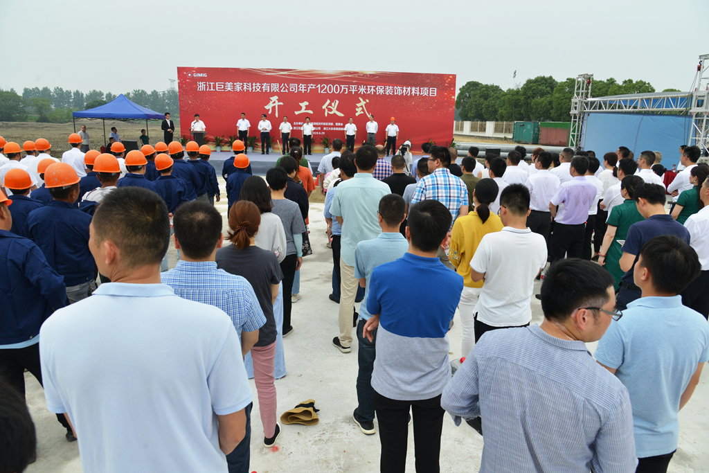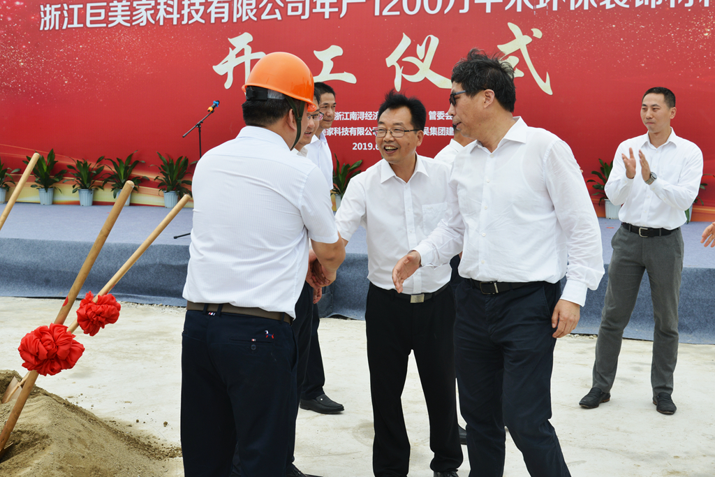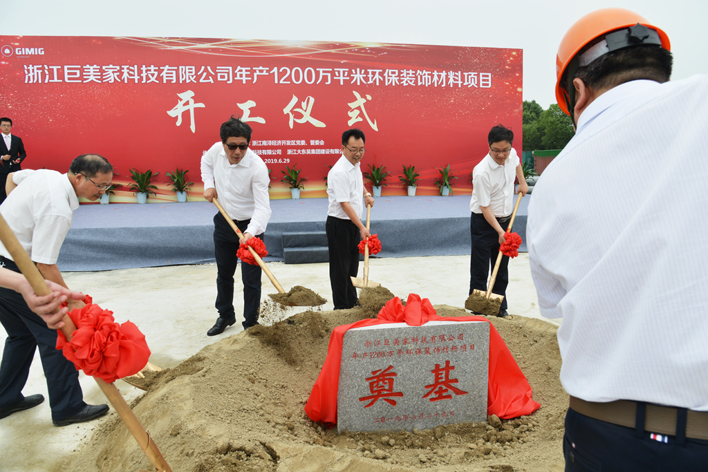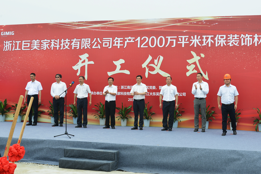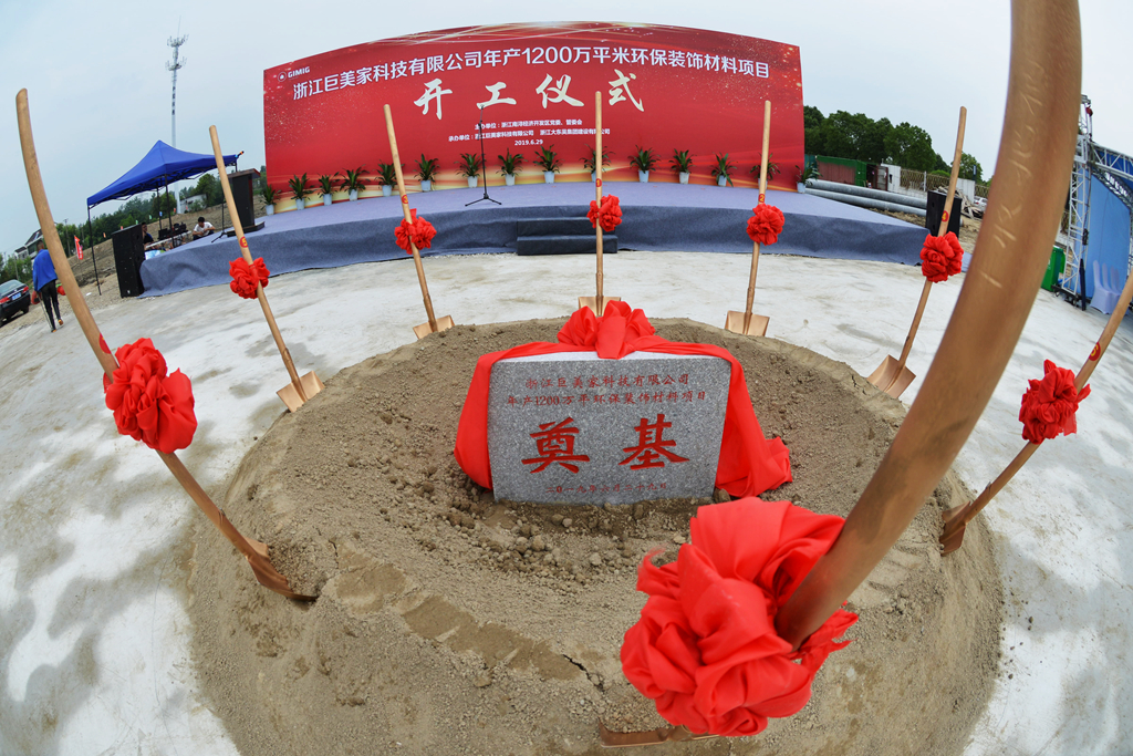 6月29日,由浙江南潯經濟開發區黨委、管委會主辦的浙江巨美家科技有限公司年產1200萬平環保裝飾材料項目開工儀式在巨美家新廠區現場隆重舉行。南潯區委書記夏堅定,區委常委、開發區黨委書記朱偉,區人大常委會副主任魏海松,開發區黨委副書記、管委會主任閔金良等黨政領導以及區級相關職能部門出席開工奠基儀式。巨人控股董事長錢江、巨美家董事長錢蘇醒、巨美家總經理錢偉民等公司領導及浙江大東吳集團建設有限公司總裁蒙二虎同時參加。