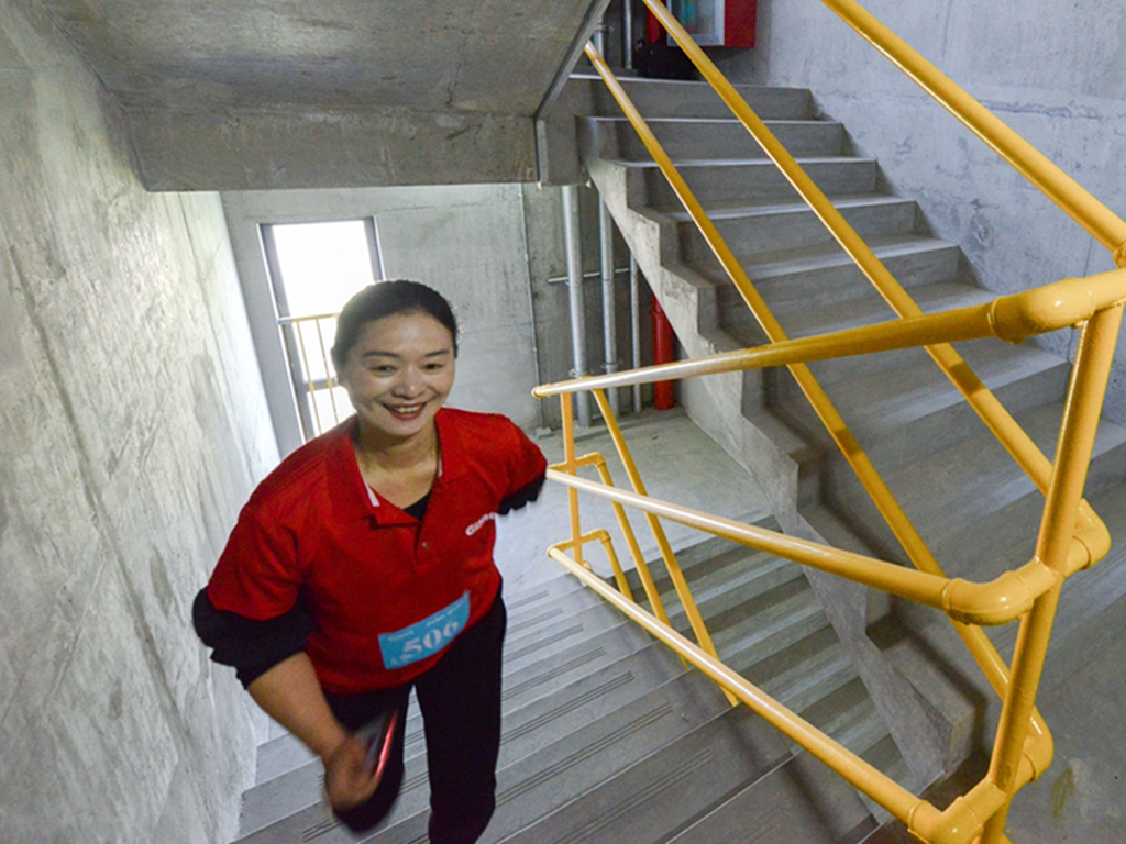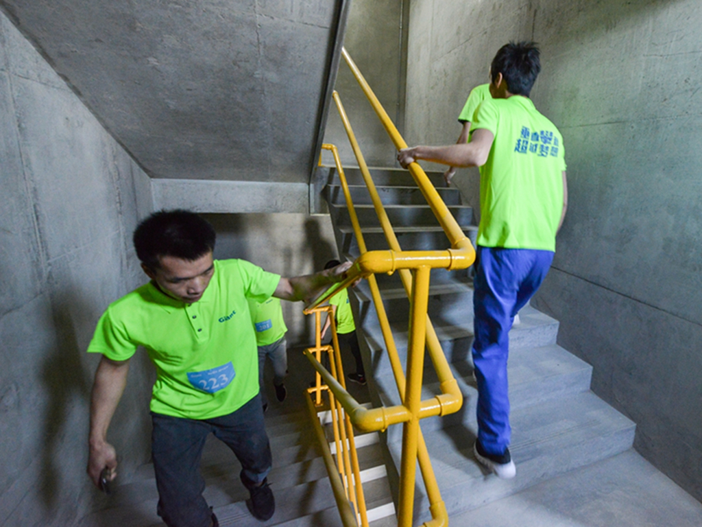 一聲令響,選手們分組出發(fā),向頂峰發(fā)起挑戰(zhàn),用奮進(jìn)的腳步垂直穿越巨龍電梯試驗(yàn)塔,競(jìng)演一場(chǎng)階梯快速對(duì)決。攀登188米(相當(dāng)于70層樓房)的垂直高度并不輕松,半程過(guò)后許多選手體力不支,需憑毅力,借助樓梯扶手繼續(xù)向上攀登,階梯上留下選手們的足跡,也灑下艱辛的汗水。